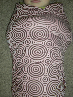 JellyBean isn't feeling well this morning. She has a runny nose and a light fever, and isn't sleeping very well. The blanky she usually uses is fuzzy on both sides with a little stretch. The stretch part is just perfect for swaddling her, so her arms don't wake her up, but the fuzzy is a bit too warm for summer, especially with a fever. With all the blankets I have for her, I just didn't have something that would fit the bill -- light with a little stretch. So, here's what I came up with!